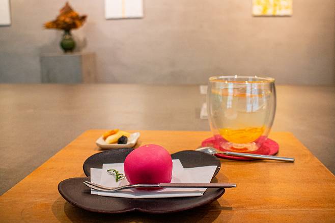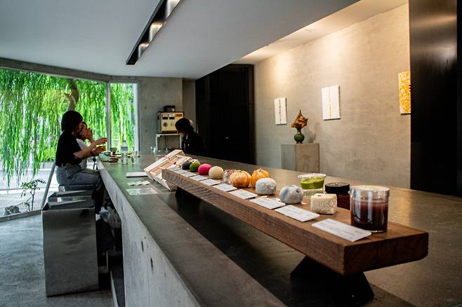 카운터 앞에는 가로로 길게 견본 모찌와 다과가 일렬로 알록달록 놓여 있는데, 이 또한 하나의 예술 작품 같다. 보기 좋은 떡이 맛도 뛰어난 법. 그중에서도 빨간색이 인상적인 모찌, 후란보와아즈다이후쿠(フランボワーズ大福)는 기분을 바꾸는 새콤달콤한 맛이 일품이다. 비트로 붉은색을 냈고, 안에는 라즈베리 퓌레가 들어가 있어 톡톡 씹힌다.