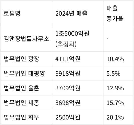로펌업계 1위 김앤장법률사무소가 1조5000억원의 매출(추정치)을 달성하며 성장세를 이어갔으며, 나머지 5대 법무법인의 매출 총액이 1조7936억원(국세청 부가가치세 신고액 기준)을 기록하며 전년 대비 12.1%의 고성장을 이뤄냈다.