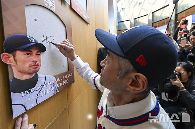 [쿠퍼스타운=AP/뉴시스] 미국 프로야구(MLB) 명예의 전당(HOF)에 헌액된 시애틀 매리너스의 전 외야수 이치로 스즈키가 23일(현지 시간) 뉴욕주 쿠퍼스타운에 있는 HOF에서 본인의 명패가 걸릴 곳에 서명하고 있다. 2025.01.24.