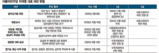 나머지 3개 재판은 1심 판결까지 상당한 시일이 걸릴 전망이다. 대장동·백현동·위례신도시 개발 의혹과 성남FC 불법 후원금 사건이 병합된 재판은 진행되는 5개 재판 중 규모가 가장 크고 복잡하다. 쌍방울 불법 후원금 사건의 경우 이 대표가 지난해 12월 법관 기피 신청을 내 대법원 판단이 나온 후에나 재판이 재개될 수 있다. 법인카드를 공무와 무관하게 사용했다는 경기도 예산 사적 유용 의혹 사건은 지난해 11월 기소돼 아직 공판 기일이 잡히지 않았다.