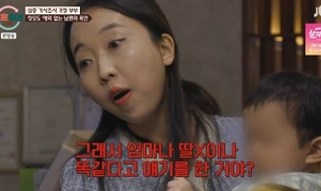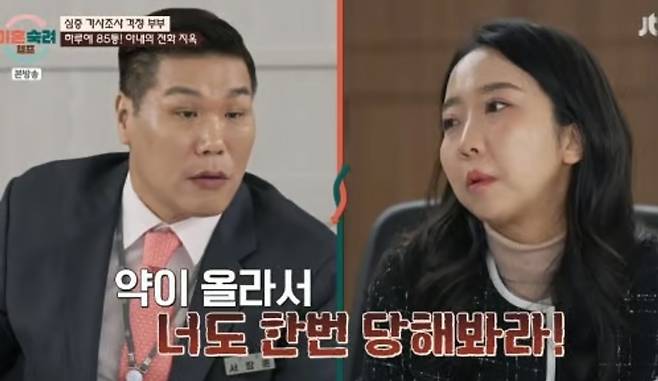 아내는 "남편 욕설로 정신과를 다니고 있다. 친정엄마가 평일에는 함께 거주하며 육아를 도와주고 있는데, '엄마나 딸이나 똑같다'라며 욕을 하더라"라고 말했다. 그 말을 듣던 서장훈은 "이건 선을 넘은 거다. 상식적인 사람이길 포기한 거다"라고 일갈했다.