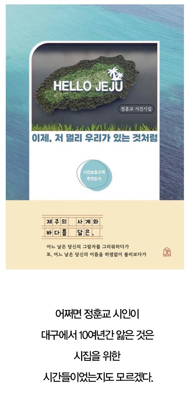 정훈교 시인의 앓이를 들었다는 시인들의 이야기를 종종 종로 길바닥에서 듣긴 했지만 마치 이국에서 온 편지처럼 그것이 어떤 힘이 되진 못했다. 그러다 책 한 권이 나에게 왔다. 정훈교 시인의 디카시집 「이제, 저 멀리 우리가 있는 것처럼」이었다. 디카시란 '디지털 카메라 시詩'의 줄임말로, 사진과 시를 결합한 시의 한 장르다. 정훈교 시인이 그간 보낸 시간이 사진과 시에 담겨 돌아왔다.