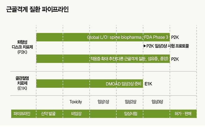 성과도 하나둘 나오고 있다. 지난해 7월 미국 스파인바이오파마에 퇴행성 디스크 치료제 ‘P2K’의 추가 적응증(치료 효과가 기대되는 병·증상)에 대한 기술을 수출했다. 골관절염, 섬유증, 종양 등에 대해서다. 이 계약으로 엔솔바이오는 ▲반환 의무가 없는 선급금 500만달러(약 72억원) ▲진행 단계별 마일스톤 1억5000만달러(약 2200억원) ▲P2K 기반 적응증 확대 제품의 미국 시판 후 순매출에 따라 10년간 별도 경상기술료(로열티) 등을 스파인바이오파마로부터 받는다.