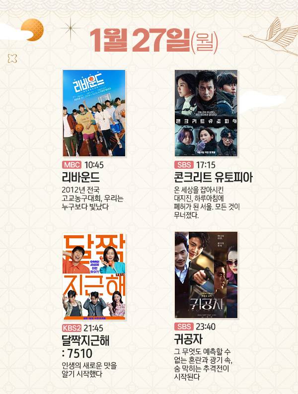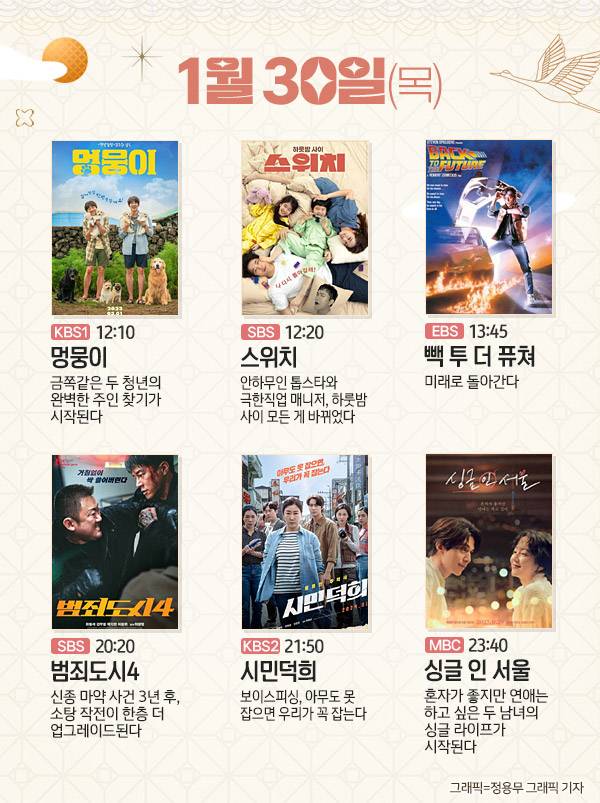 [더팩트ㅣ최수빈 기자] 27일이 대체 공휴일로 지정되면서 25일부터 30일까지 무려 6일간의 긴 설 연휴가 시작된다. 이에 방송사에서도 다양한 특선 영화를 준비했다. 명절이면 빠질 수 없는 국민영화부터 최신 흥행작까지 설 연휴를 더욱 풍성하게 만들어 줄 특선 영화 편성을 정리했다.
