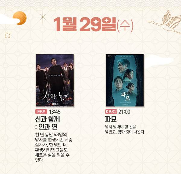 지난해 1190만 관객을 동원하며 K오컬트 장르의 신드롬을 일으킨 영화 '파묘'(감독 장재현)도 만나볼 수 있다. 작품은 거액의 돈을 받고 수상한 묘를 이장한 풍수사와 장의사 그리고 무속인들에게 벌어지는 기이한 사건을 담은 오컬트 미스터리 영화다. 배우 최민식 김고은 유해진 이도현이 출연하며 29일 오후 9시 KBS2에서 시청할 수 있다.
