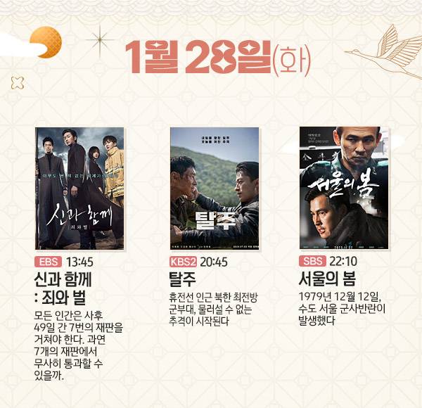 1441만 관객의 사랑을 받은 영화 '신과 함께-죄와 벌'(감독 김용화)이 28일의 포문을 연다. 작품은 저승에서 온 망자가 그를 안내하는 저승 삼차사와 함께 49일 동안 7개의 지옥에서 재판을 받으며 벌어지는 이야기를 그린 영화다. 배우 하정우 차태현 주지훈 김향기가 출연했으며 28일 오후 1시 45분 EBS에서 방송한다.