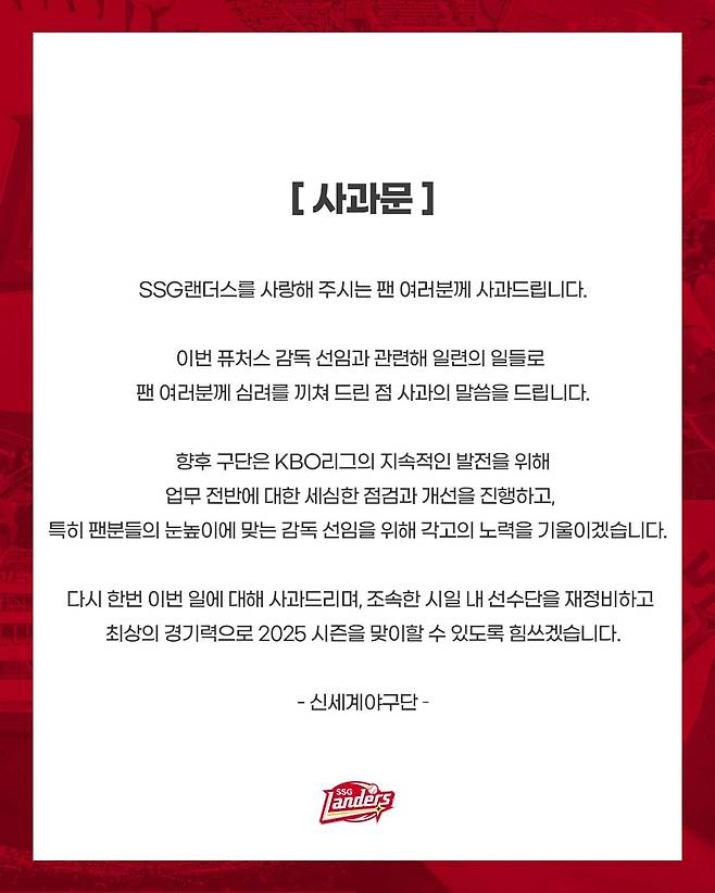 SSG 구단은 "SSG 랜더스를 사랑해 주시는 팬 여러분께 사과드립니다. 이번 퓨처스 감독 선임과 관련해 일련의 일들로 팬 여러분께 심려를 끼쳐 드린 점 사과의 말씀을 드립니다"라고 적었다.