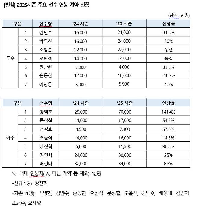 마무리 투수 박영현은 1억6000만원에서 2억4000만원으로 50% 인상됐고, 김민수는 1억6000만원에서 2억1000만원으로 31.3% 상승했다. 소형준은 2억2000만원에 동결을 기록했다.