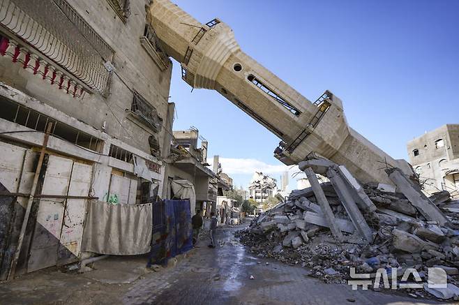 [누세이라트=AP/뉴시스] 이스라엘과 하마스 간 휴전 협정이 발효된 지 5일째인 24일(현지 시간) 가자지구 누세이라트에서 팔레스타인 주민들이 이스라엘 공습으로 파괴된 사원 앞을 지나고 있다. 2025.01.25.