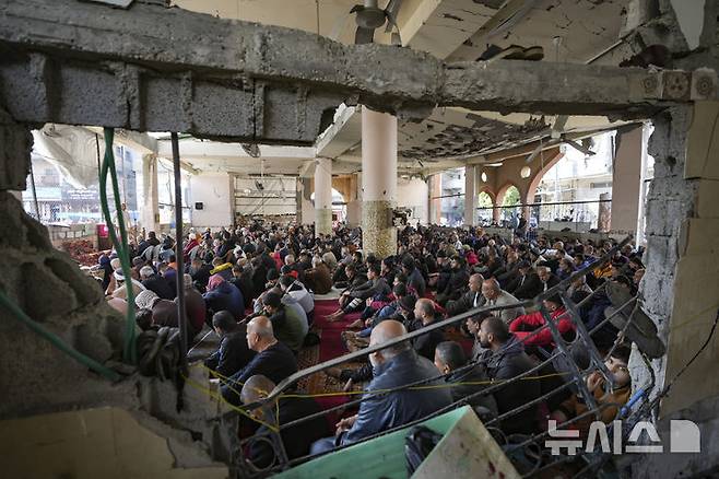 [칸유니스=AP/뉴시스] 이스라엘과 하마스 간 휴전 협정이 발효된 지 5일째인 24일(현지 시간) 가자지구 칸유니스에서 팔레스타인 주민들이 이스라엘 공습으로 파괴된 한 사원에서 금요 기도를 드리고 있다. 2025.01.25.