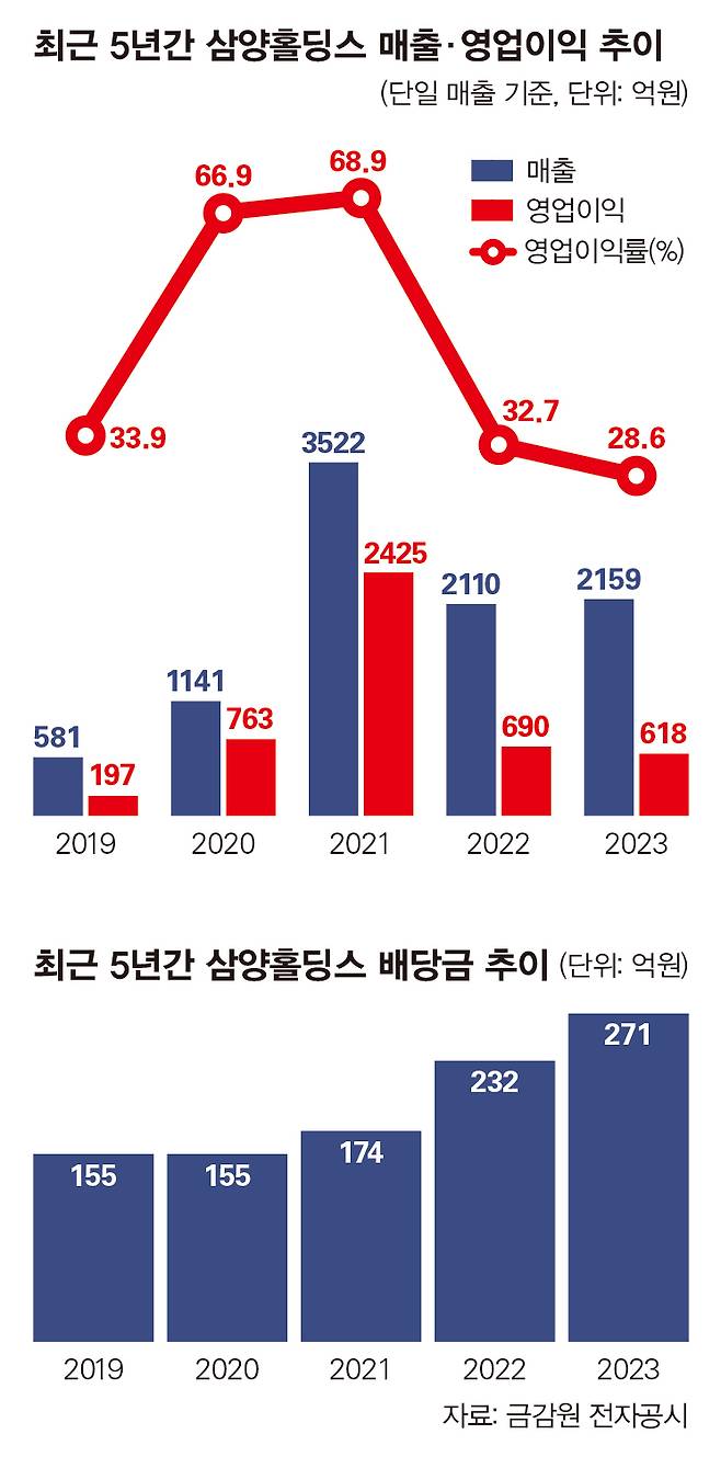 하지만 삼양이노켐의 감사보고서를 보면, 2022년에도 이 회사 매출은 전년 대비 31.3%(5614억원→3859억원)나 감소했다. 같은 기간 영업이익과 당기순이익은 각각 86.8%와 89.9%까지 줄어들었다. 삼양홀딩스에 준 배당금(1299억원)이 그해 거둔 순이익(234억원)의 5배 이상에 이른다는 점에서 고배당 논란이 예상된다.
