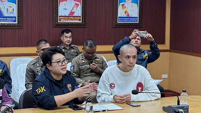 ▲ 태국에서 납치돼 미얀마로 끌려갔다가 풀려난 중국 배우 왕싱(31·오른쪽)이 지난 7일(현지시간) 태국 서부 딱주에서 태국 경찰과 함께 기자회견을 하고 있다.