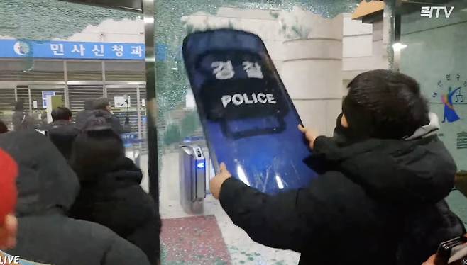 | ▲ 윤석열 대통령이 19일 새벽 3시경 내란 우두머리 및 직권남용 권리행사 방해 혐의로 구속되자, 서울 마포구 서울서부지방법원(서부지법) 주변에서 시위를 벌이던 지지자들이 법원에 난입했다. 이들은 진입 과정에서 경찰을 폭행하고 건물 외벽 및 유리창을 부수고 들어가 출입문, 각종 집기 등을 부쉈다. |