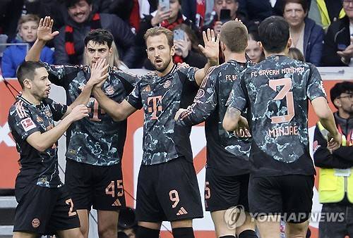 epa11851964 Harry Kane of Munich (C) celebrates with teammates after scoring the 0-1 goal during the German Bundesliga soccer match between SC Freiburg and FC Bayern Munich in Freiburg, Germany, 25 January 2025. EPA/RONALD WITTEK CONDITIONS - ATTENTION: The DFL regulations prohibit any use of photographs as image sequences and/or quasi-video.