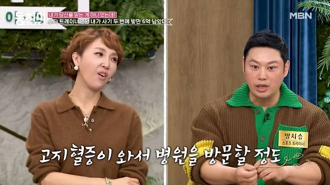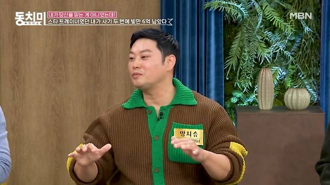 25일 방송된 MBN '속풀이쇼 동치미'에서 스포츠 트레이너 양치승은 "스타 트레이너였던 내가 사기 두 번에 빚만 6억 남았다"는 제목으로 이야기를 풀어갔다.