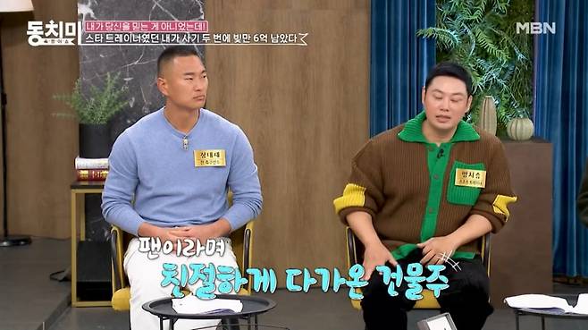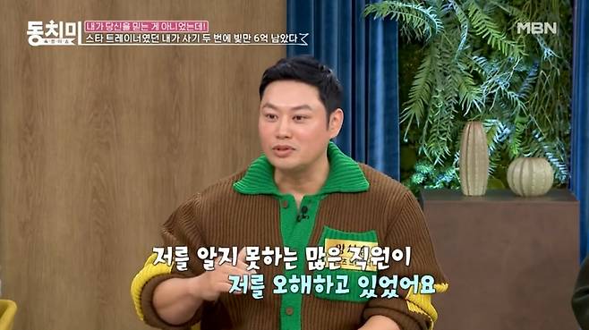 25일 방송된 MBN ‘속풀이쇼 동치미’에서 스포츠 트레이너 양치승은 “스타 트레이너였던 내가 사기 두 번에 빚만 6억 남았다”는 제목으로 이야기를 풀어갔다.