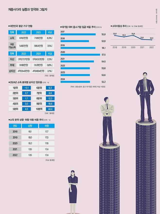 더 큰 문제는 소득과 자산 격차가 벌어질수록 계층 간 이동은 더 어려워진다는 점이다. 양극화가 경제적·사회적 성공을 위한 '기회의 평등'마저 위협하고 있다는 거다. 통계청이 지난 12월 처음으로 발표한 '소득이동통계(2017~2022년 조사)'는 계층사다리가 사라지는 한국의 민낯을 보여줬다. 소득이동통계는 기회의 평등을 측정한 지표다. '소득이동성'이 낮아질수록 기존의 소득 분위가 고착화하고, 시간이 흐를수록 소득 격차를 해소하기 어려워진다.