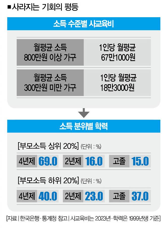 사교육 의존도가 높아지면서 부모의 경제력이 자녀의 학력 격차로 그대로 이어졌다. 부모 소득이 상위 20%(5분위)인 가구의 자녀(이하 1999년생 기준)의 경우 4년제 이상 진학률은 69.0%, 2년제 16.0%, 고졸 15.0%로 나타났다. 반면 부모 소득이 하위 20%(1분위)인 가구 자녀의 경우 4년제 이상 40. 0%, 2년제 23.0%, 고졸 37.0%였다. 경제적 '결과의 불평등'이 '기회의 불평등'으로 이어진 셈이다.