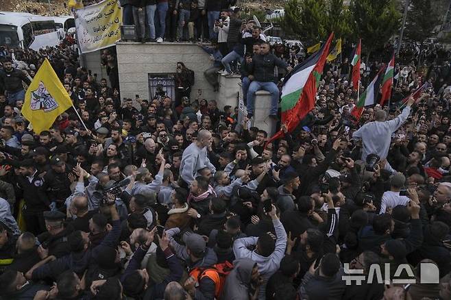 [라말라=AP/뉴시스] 이스라엘이 석방한 팔레스타인 수감자들이 회색 죄수복을 입은 채 25일(현지 시간) 서안지구 라말라에서 군중의 환영을 받고 있다. 이스라엘과 하마스 간의 휴전 협정에 따라 이스라엘 여군 인질 4명과 팔 수감자 200명이 석방됐다. 2025.01.26.