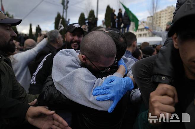 [라말라=AP/뉴시스] 이스라엘이 석방한 팔레스타인 수감자들이 회색 죄수복을 입은 채 25일(현지 시간) 서안지구 라말라에서 군중의 환영을 받고 있다. 이스라엘과 하마스 간의 휴전 협정에 따라 이스라엘 여군 인질 4명과 팔 수감자 200명이 석방됐다. 2025.01.26.