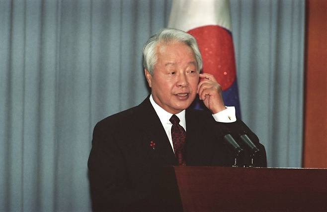 | ▲ 1997년 1월, 김영삼 대통령이 청와대 춘추관에서 전국에 TV와 라디오를 생중계 된 가운데 내외신 연두회견을 열고 있다. |