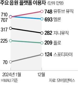 음원 플랫폼 사업은 성장 정체 현상을 겪고 있다. 모바일 빅데이터 플랫폼 모바일인덱스에 따르면 주요 음원 플랫폼 가운데 월간활성이용자(MAU, 지난해 1~12월)가 늘어난 플랫폼은 유튜브 뮤직과 스포티파이뿐이다.