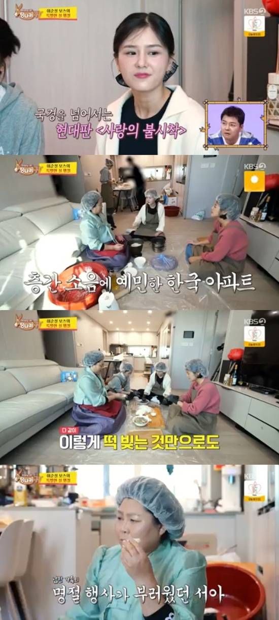 김서아는 이순실이 절구에 찹쌀을 넣고 절구질을 하려고 하자 바로 제지하며 층간 소음을 주의해야 한다고 말했다.