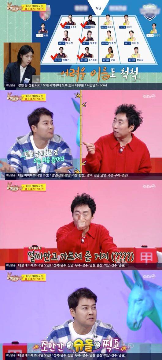 이를 스튜디오에서 지켜보던 박명수는 “저건 현무가 가르쳐 주는 걸 봤다. 밤에 얼싸안고 가르쳐 준 것”이라며 ‘가짜뉴스’를 퍼트렸고, 전현무는 “저는 배구 중계를 처음 본다”라고 항변했다. 김숙 역시 “이렇게 말하면 진짜 기사 난다”라며 우려했지만, 전현무는 곧 “조만간 ‘슈퍼맨이 돌아왔다’ 한번 찍죠. 뭐”라고 대응해 웃음을 자아냈다.
