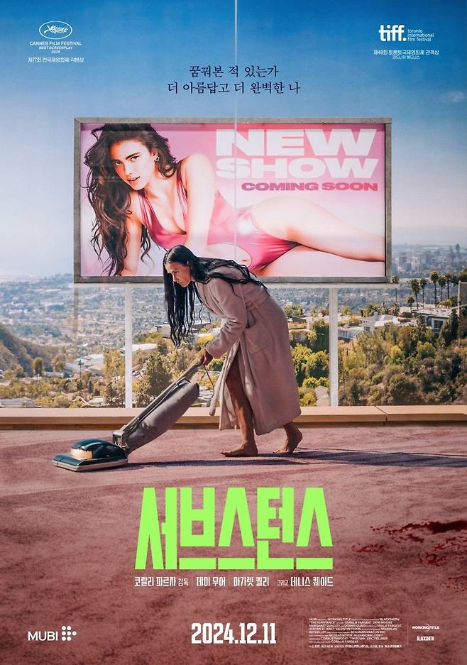 '서브스턴스'는 나, 그리고 더 나은 버전의 나와의 지독한 대결을 그린 논스톱 블러디 스릴러물로 '리벤지' 코랄리 파르쟈 감독이 메가폰을 잡고 데미 무어, 마가렛 퀄리 등이 출연한 작품이다.