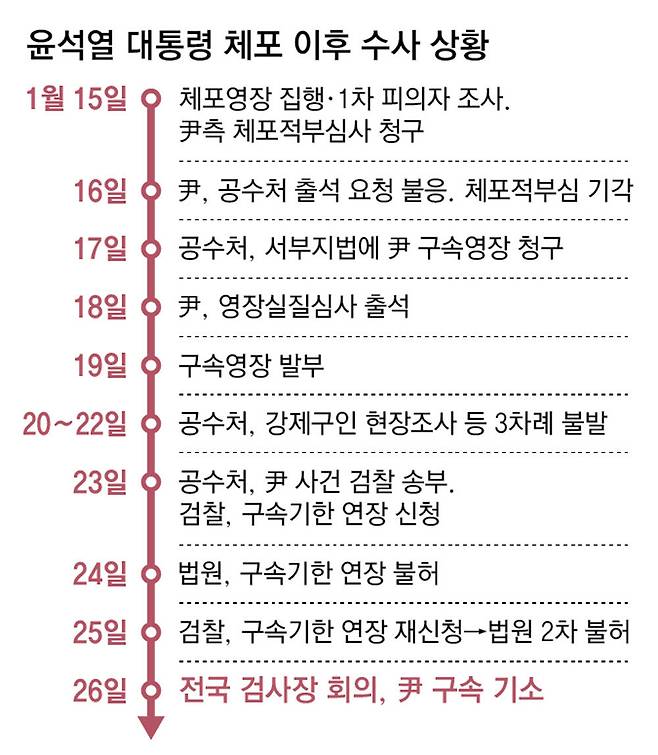 전국 고검장, 지검장들은 26일 오전 10시 서울 서초구 대검찰청에 모여 12·3 비상계엄 관련 내란 우두머리(수괴) 혐의를 받는 윤석열 대통령에 대한 처리 방향을 논의했다. 구속영장 기한 만료를 하루 앞두고 모인 검사장들은 취재진의 질문에도 별다른 말 없이 회의장으로 들어갔고, 약 2시간 50분 뒤 회의가 끝나자 서둘러 대검을 떠났다. 오후 7시경 검찰 비상계엄 특별수사본부(본부장 박세현 서울고검장)는 “피고인에 대해 기소함이 충분하다고 판단했다”며 윤 대통령을 구속 기소했다고 밝혔다. 대검은 “검찰 특수본의 ‘그간 수사 경과에 비춰 구속 취소할 사정 변경이 있다고 볼 수 없다’ 등의 의견 등을 종합해 공소제기를 지시했다”고 발표했다.