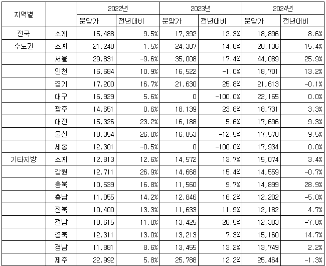 전국 기준 평당 분양가도 1천889만6천원으로 최고치를 찍었으나 상승률은 2023년에 가장 높았다.
