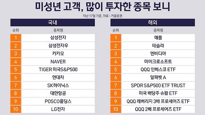 다른 증권사 미성년 고객들도 비슷한 투자 흐름을 보였습니다. KB증권에 따르면 지난달 말 기준 가장 많이 보유한 국내 주식은 역시 삼성전자였습니다. 해외주식 1위는 테슬라였고, 엔비디아, 애플이 뒤를 이었습니다.