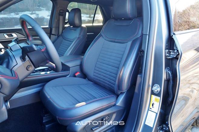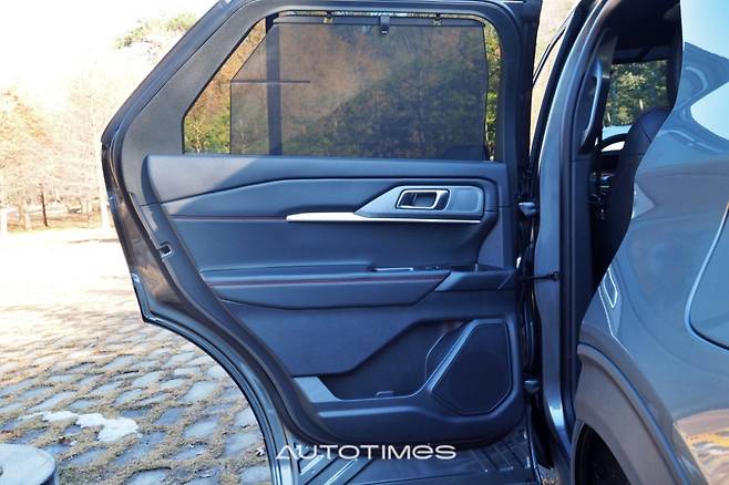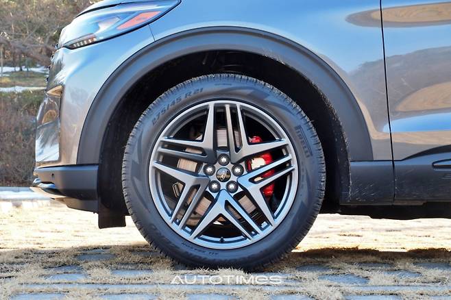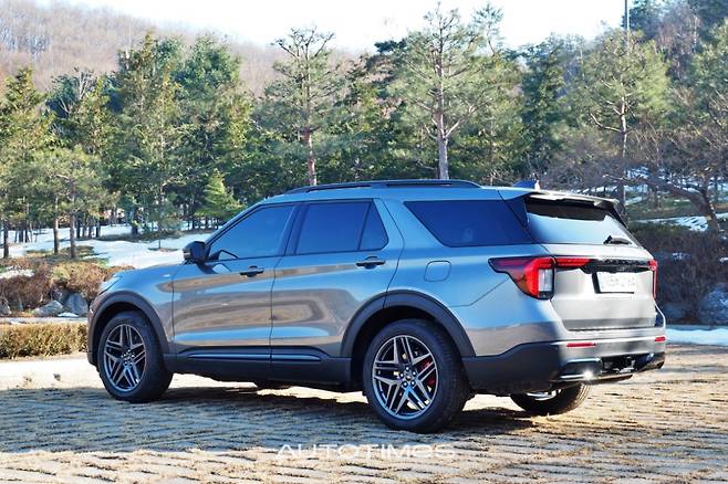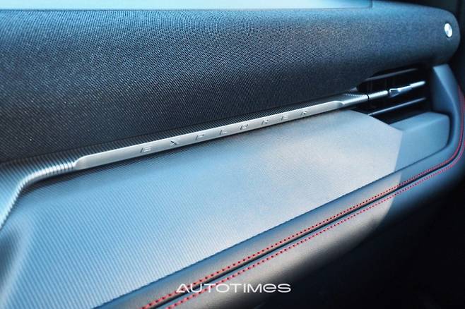 안개등이 위치한 범퍼 양 끝단 장식을 비롯해 스플리터, 보닛에 붙은 익스플로러 레터링은 반짝이는 블랙으로 마감해 고급 감을 높인다. 옆은 휠 타이어 조합이 인상적이다. 건메탈 재질로 별 모양 휠이 시선을 사로잡고 안쪽을 채우는 레드 브레이크 캘리퍼가 스포티한 감각을 배가시킨다. 오랫동안 포드가 사용해온 B-필러 터치 도어락은 과감이 삭제했다. 대신 ST-라인 배지와 사이드 미러, 윈도우 몰딩 주변에 유광 블랙을 둘러 요즘 흐름을 잘 반영한 모습이다.