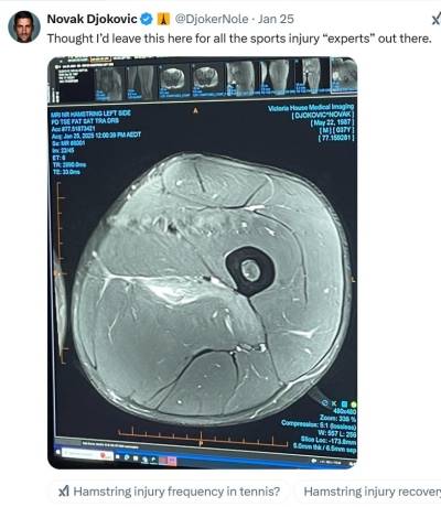 대회가 끝났음에도 그치지 않는 '의혹'에 대해 보다 못한 조코비치가 행동에 나섰다. 조코비치는 1월 25일 공식 X를 갱신하면서 왼쪽 허벅지가 심하게 손상됐음을 보여주는 MRI 영상을 공개한 것이다. 조코비치는 "스포츠 상해 전문가 여러분을 위해서, 이 영상을 여기에 남겨 두려고 생각했다"는 약간 느낌있는 말을 썼다.