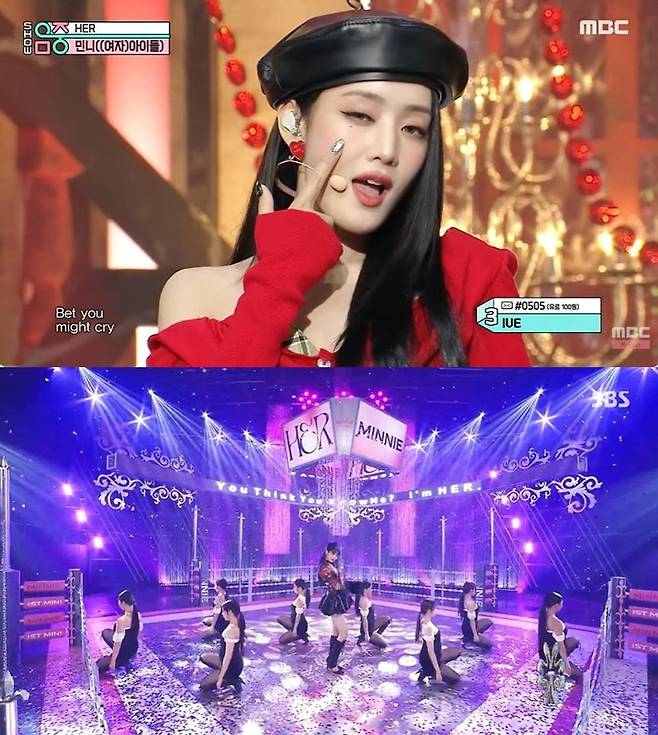 이어 민니는 23일 Mnet '엠카운트다운'을 시작으로 KBS2 '뮤직뱅크', MBC '쇼! 음악중심', SBS '인기가요' 등 각종 음악방송에 출연해 'HER' 무대를 선보였다. 민니는 안대를 착용하는 파격적인 퍼포먼스, '11시 25분' 포인트 안무, 다채로운 콘셉트 무대 등 완성도 높은 퍼포먼스를 선보여 보는 이들의 눈과 귀를 사로잡았다.