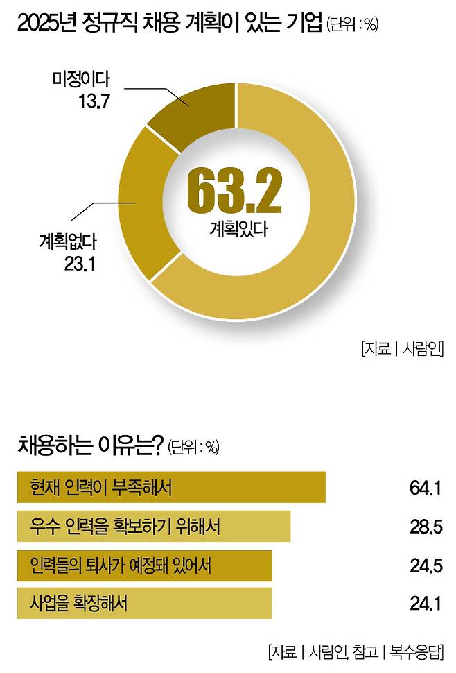 올해 채용 계획이 있는 기업은 몇 곳일까. 커리어 플랫폼 사람인이 511개 기업에 '2025년 정규직 채용 계획'을 조사한 결과, 10곳 중 6곳(63.2%)이 올해 정규직을 채용할 계획이라고 말했다. 채용 계획이 없는 기업은 23.1%였고, 채용 계획이 미정인 곳은 13.7%였다.