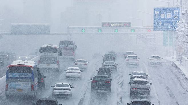 ▲ 설 전날인 28일 대설 경보가 발효 중인 경기도 용인시 경부고속도로 수원신갈IC 부근에서 차량이 서행하고 있다.