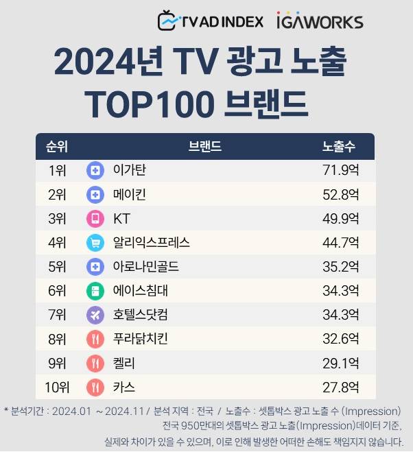 28일 데이터플랫폼 스타트업 아이지에이웍스가 운영하는 'TV애드 인덱스'에 따르면, 지난해 1월부터 11월까지 TV에 가장 많이 나온 광고 1위는 71억9000만회가 노출된 명인제약의 잇몸 보조치료제 '이가탄'으로 나타났다. 2위는 같은 명인제약의 소화기관 치료제 '메이킨'으로 52억8000만회가 노출됐다.