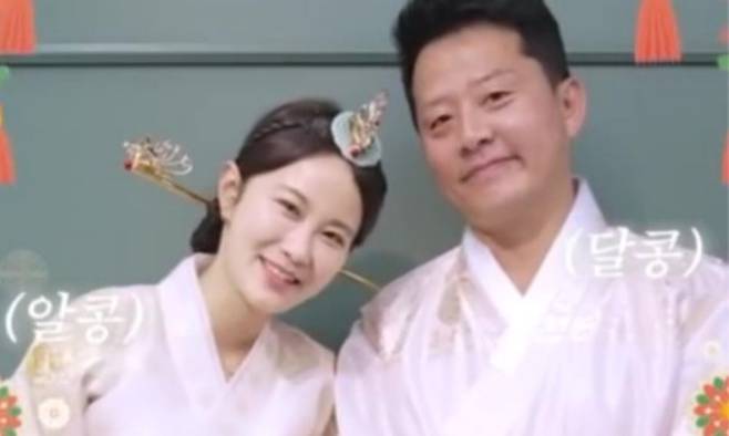 올해 결혼을 앞둔 방송인 김준호와 김지민이 한복을 입고 새해 인사를 전했다.
