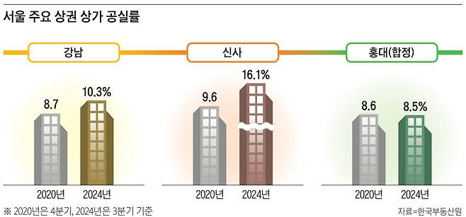 한국부동산원에 따르면, 2024년 3분기 기준 서울 3층 이상 중대형 상가와 2층 이하 소규모 상가 공실률은 각각 8.7%, 4.9%를 기록했다. 이는 2019년 4분기(8.0%, 3.9%)보다 악화한 수치다. 특히 강남 공실률은 코로나19 팬데믹 때보다 심각하다. 강남대로 중대형 상가 공실률은 2024년 3분기 10.3%로 코로나19 팬데믹이 한창이던 2020년 4분기(8.7%)보다 1.6%포인트 뛰었다. 가로수길이 있는 신사역 인근 공실률도 같은 기간 9.6%에서 16.1%로 급등했다. 코로나19 팬데믹으로 위축된 소비 심리가 회복될 기미가 보이지 않기 때문이다. 엔데믹 이후 급격한 금리 상승도 중요한 원인이다. 경기가 회복된다고 해도 소비구조가 오프라인에서 온라인으로 바뀌면서 어중간한 상가는 살아남기 힘든 상황이 됐다.