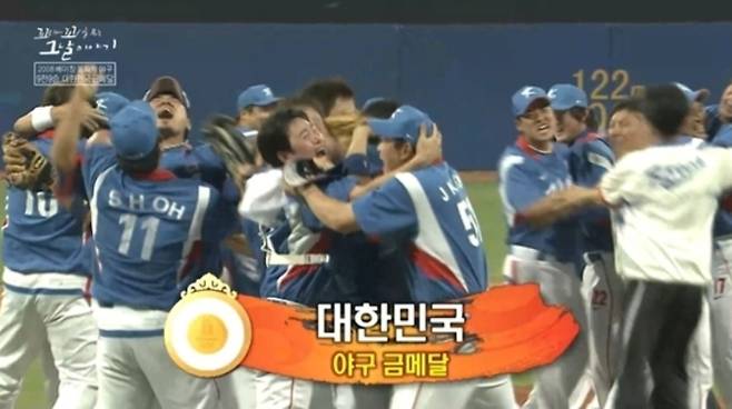 장성규는 “이날 심판 판정에 항의한 강민호 선수가 퇴장을 당하면서, 다리를 절뚝거리며 진갑용 선수가 포수로 나섰고, 투수도 류현진 선수에서 정대현 선수로 교체됐다”며 대한민국의 위기를 생생하게 전달했다. 긴장감이 최고조에 달한 9회 말, 쿠바가 투 스라이크 아웃 상황에서 병살타를 치면서 드디어 대한민국이 9전 전승으로 야구 역사상 첫 올림픽 금메달을 이룩했다. 류현진은 “영화로 만들어도 될 정도로 아무나 못 만드는 경기가 매 경기가 나왔다”고 그때의 감격을 전했다.이승엽은 “기분이 하늘을 날아갈 듯 좋았고 ‘아 야구 하기 잘했구나’ 우리가 해냈구나”고 밝혔고, 류현진은 “제 야구인생에서 바꿀 수 없는 경험이다”, 윤석민은 “’내가 국대가 안 됐다면’, 이런 여러 생각이 스쳐 지나갔다”, 이택근은 “아들한테 얘깃거리가 되고 가족에게 추억이다”, 정근우는 “악동 같았던 정근우를 깊은 야구선수로 만들어줬다”, 강민호는 “내가 야구를 더 잘해서 더 유명한 사람이 되어야 한다고 느끼게 해준 올림픽이었다”고 소감을 전했다. 이어 스튜디오에는 이택근 선수의 당시 금메달이 공개되며 그날의 감동을 생생히 전파했다.