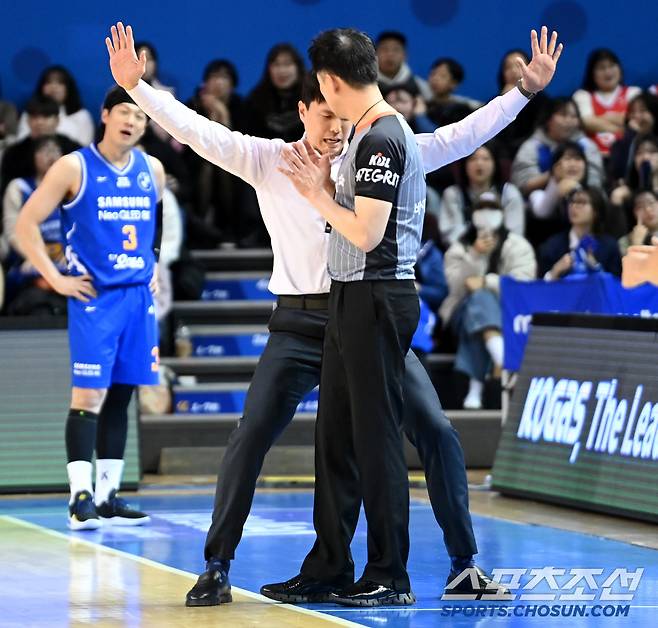 29일 잠실실내체육관에서 열린 프로농구 서울 삼성과 서울 SK의 경기, 삼성 김효범 감독이 판정에 어필하고 있다. 잠실실내체=허상욱 기자 wook@sportschosun.com/2025.01.29/