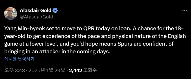 영국 축구 매체 '풋볼 런던'에서 토트넘을 전담 취재하는 알레스데어 골드 기자는 29일(한국시간) 오후 3시48분 자신의 SNS를 통해 "양민혁이 오늘 QPR로 임대 이적한다"며 "18세 선수가 영국 축구의 속도와 신체적 특성을 더 낮은 수준에서 경험할 수 있는 기회다. 이는 토트넘이 며칠 안에 공격수를 영입할 수 있을 것으로 확신한다는 의미이기도 하다"고 밝혔다.