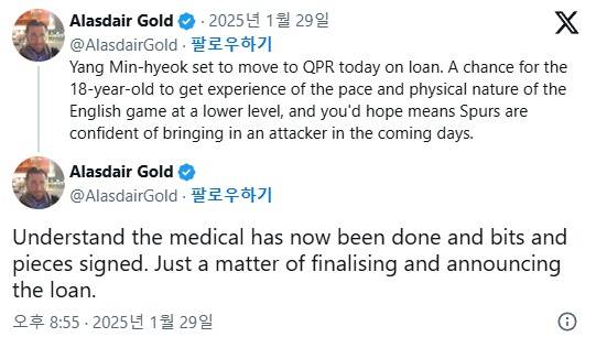 골드 기자는 29일 자신의 SNS를 통해 "양민혁은 오늘 QPR로 임대 이적한다"라며 "양민혁이 영국 축구의 속도와 신체적 특성을 더 낮은 수준에서 경험할 수 있는 기회이며, 이는 토트넘이 앞으로 며칠 안에 공격수를 영입할 수 있을 것이라고 확신한다는 것을 의미한다"라고 설명했다.