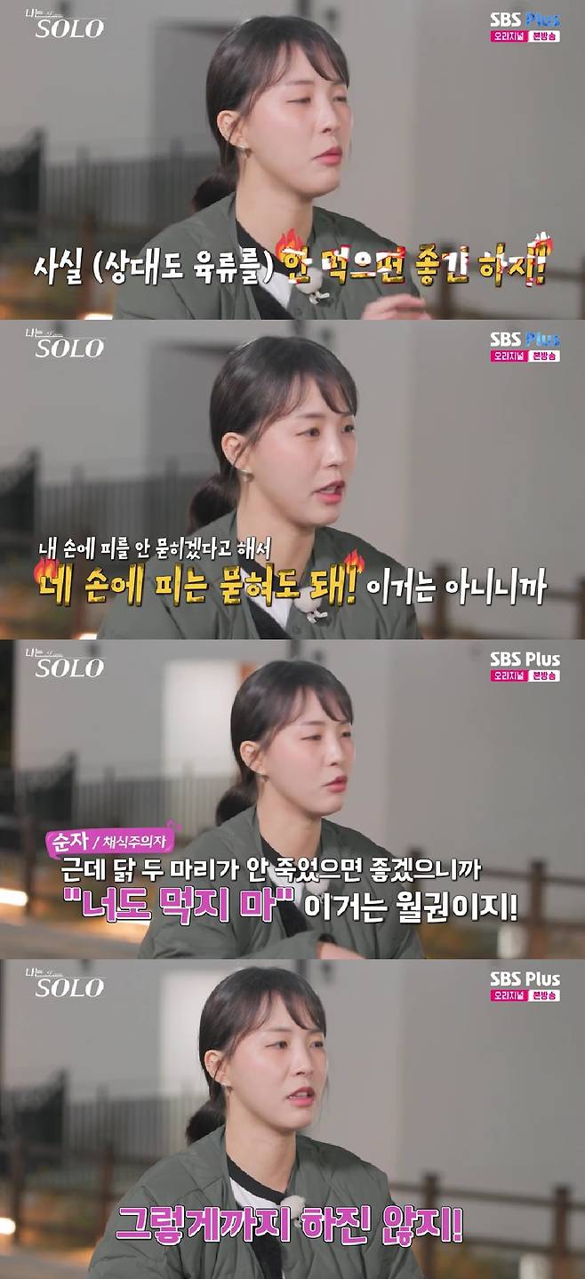 이어 순자는 "사실 상대방도 (고기를) 안 먹으면 좋다. 내 손에 피를 안 묻히겠다고 해서 '네 손에 피는 묻혀도 돼' 이건 아니다"고 말했다.