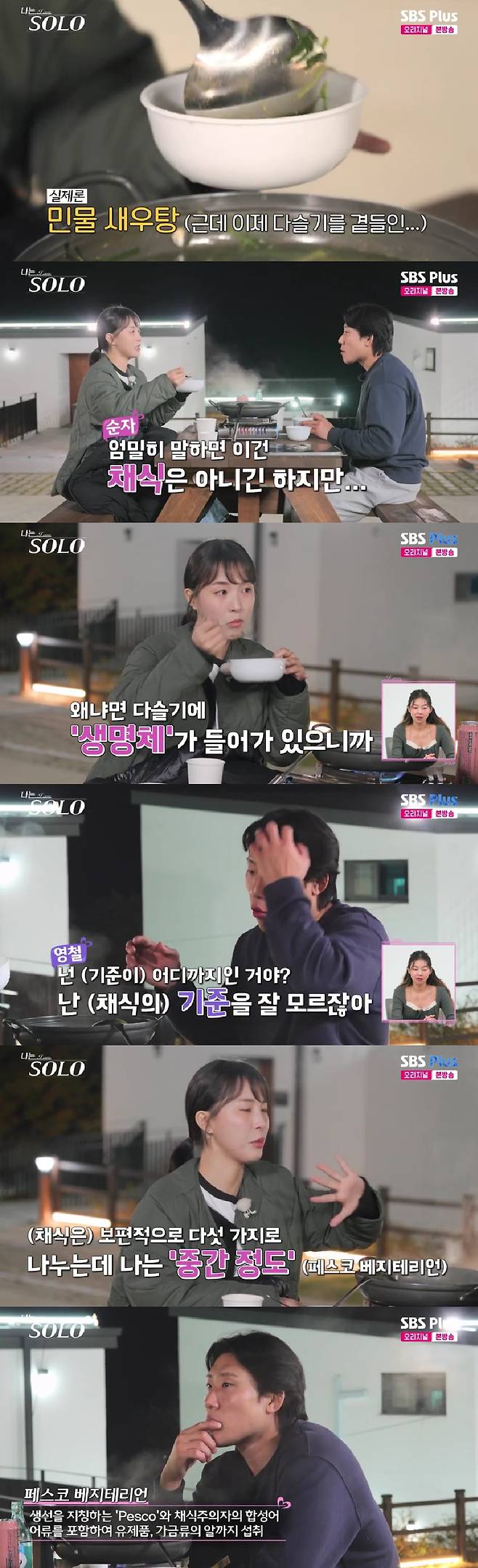 영철이 "넌 (기준이) 어디까지냐. 난 (채식의) 기준을 모른다"고 묻자 순자는 "크게 보편적으로 다섯 가지로 나누는데 나는 중간 정도다"며 "완전 살점만 안 먹고 해산물이나 동물들의 부산물이라고 해야 되나?"고 어류를 포함하여 유제품, 가금류의 알까지 섭취하는 '페스코 베지테리언'임을 드러냈다.