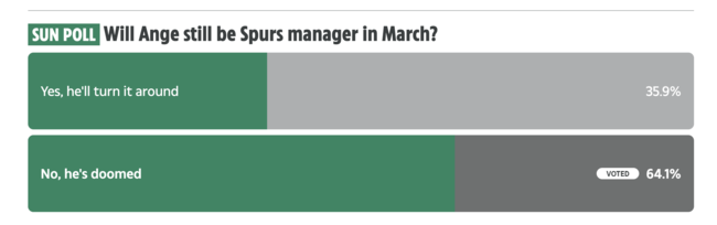 ‘더선’의 축구팬 설문조사에 따르면 포스테코글루가 경질될 것이라는 투표가 무려 64.1%의 지지를 얻었다. 포스테코글루가 반등할 것이라는 의견은 35.9%에 불과했다. / jasonseo34@osen.co.kr