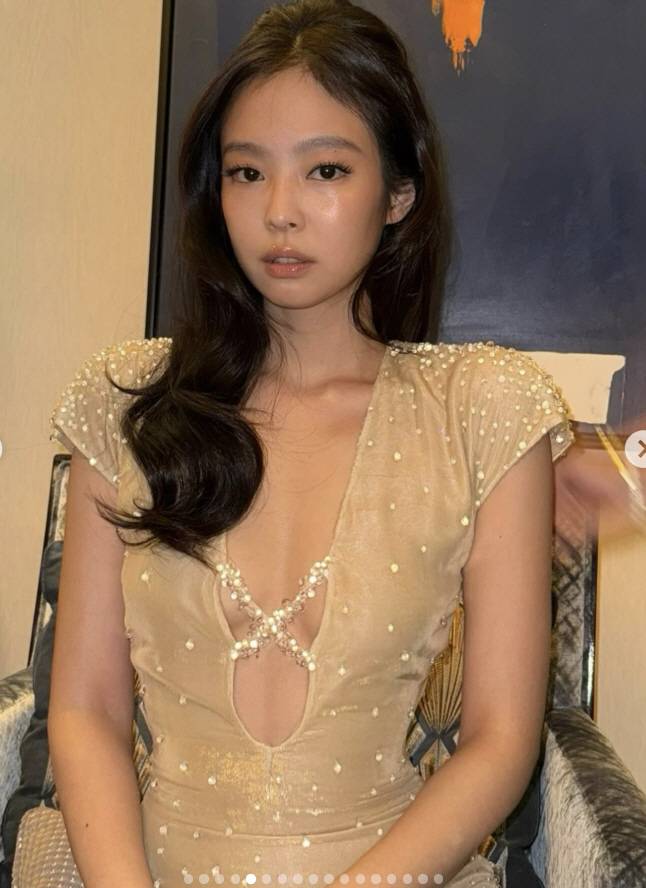 사진 속 제니는 클래비지룩으로 가슴라인이 깊이 파인 머메이드 드레스에 보석 장식 끈으로 여민 실크 소재의 누드톤 드레스를 입고 우아한 라인을 뽐냈다.