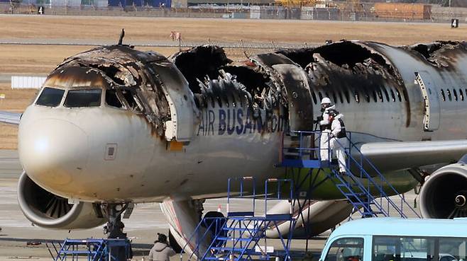 ▲ 30일 오전 부산 강서구 김해국제공항에서 항공철도사고조사위원회와 부산경찰청, 부산소방재난본부, 국립과학수사연구원이 화재 합동 감식을 앞두고 안정성 확보를 위한 현장 점검을 실시하고 있다.