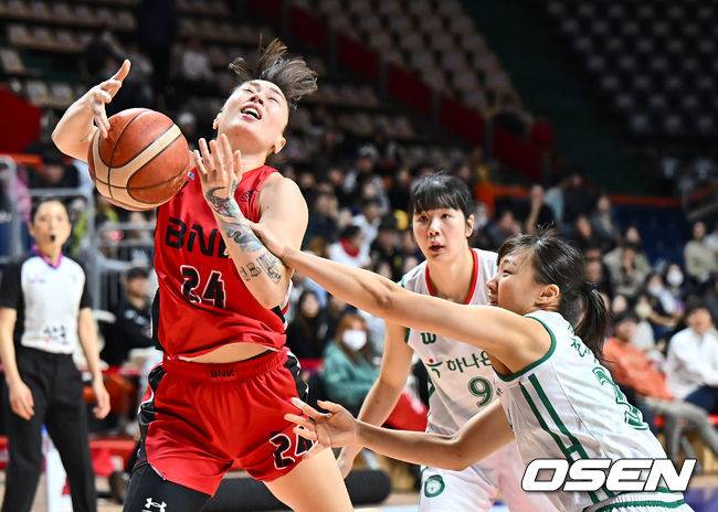 부산 BNK 썸 김소니아가 부천 하나은행 정예림의 파울에 볼을 놓치고 있다. 2025.01.30 / foto0307@osen.co.kr